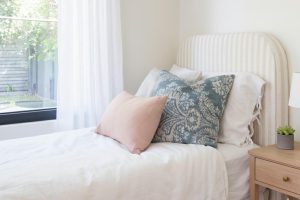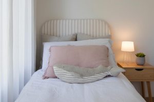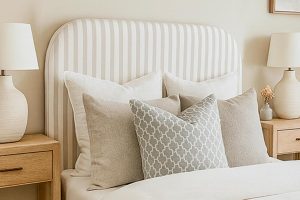 Materiales: Respaldo de estructura masisa acolchado y tapizado en blanco. Además trae una funda removible y lavable fabricada en la tela elegida por el cliente.