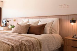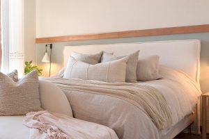 Materiales: Respaldo de estructura masisa acolchado y tapizado en blanco. Además trae una funda removible y lavable fabricada en la tela elegida por el cliente.